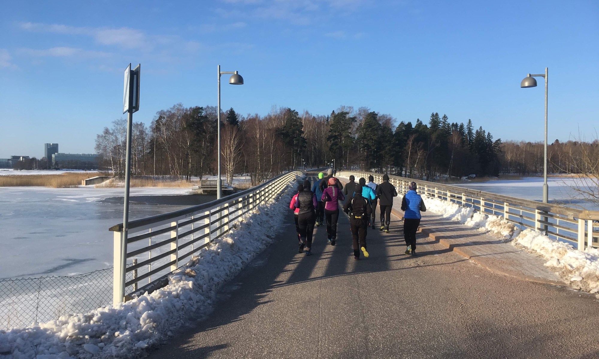 Espoon Tapioiden Juoksuklubi järjestää jäsenilleen joka sunnuntai yhteislenkin. Vauhtiryhmiä on yleensä muutama, ja tällä kertaa valitsin 6:40 min/km -vauhtisen ryhmän. Meitä olikin kokonainen tusina ryhmässä, joka eteni puheensorinan säestämänä. Hiljenimme vain, kun piti juosta kapeaa lumeen tamppaantunutta polkua tai kun maa oli niin jäässä, että kaikki keskittyminen piti olla jaloissa.