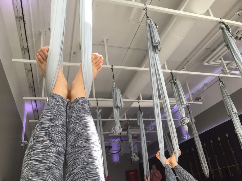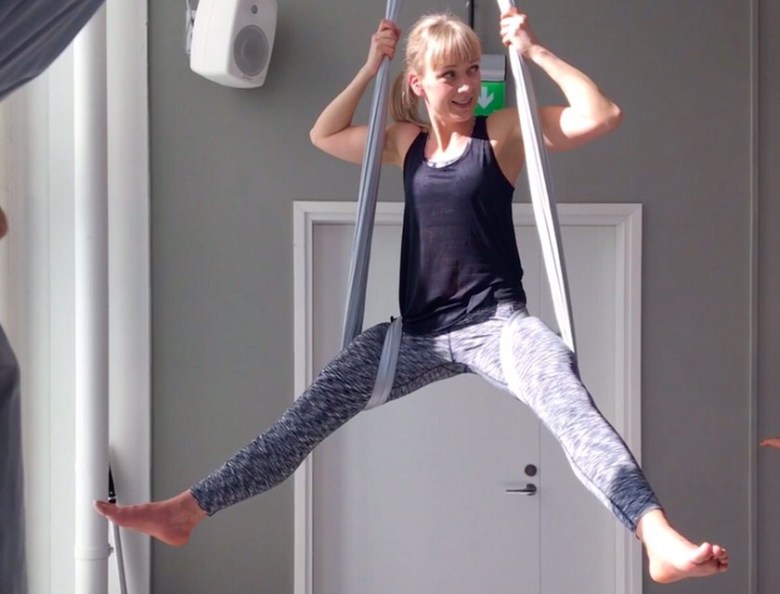 Ennen ilmajoogatunnille menoa minulla oli taas sama tunne: ei ole välttämättä minun juttuni. Mutta olin väärässä. Liinojen avulla sain kammettua itseni yläilmoihin ja liinat avustivat tunnin loppupuolella tehdyissä avaavissa liikkeissä. Esimerkiksi takareiden venytys tehtiin laittamalla toinen jalka suorana lenkkiin ja siitä taivutettiin ylävartaloa eteenpäin.