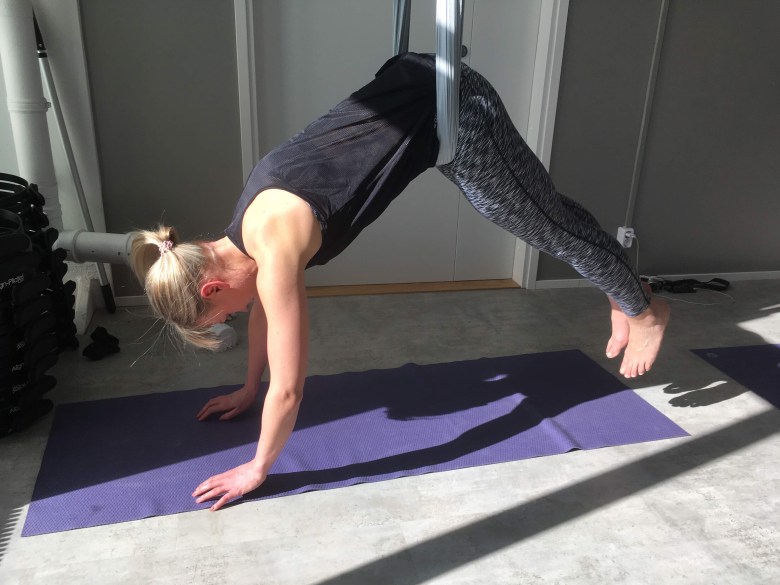 Ja pian olinkin liinan varassa jalat kohti kattoa. Uskomatonta! Marikon vaihe vaiheelta etenevien ohjeiden avulla ilmajoogan ensikertalainenkin onnistui. Yksi ilmajoogan ulottuvuus on tietenkin sen hauskuus, mutta se parantaa myös liikkuvuutta ja on erittäin hyvää selälle. Eipä sitä kovin usein tule roikuttu pää alaspäin.