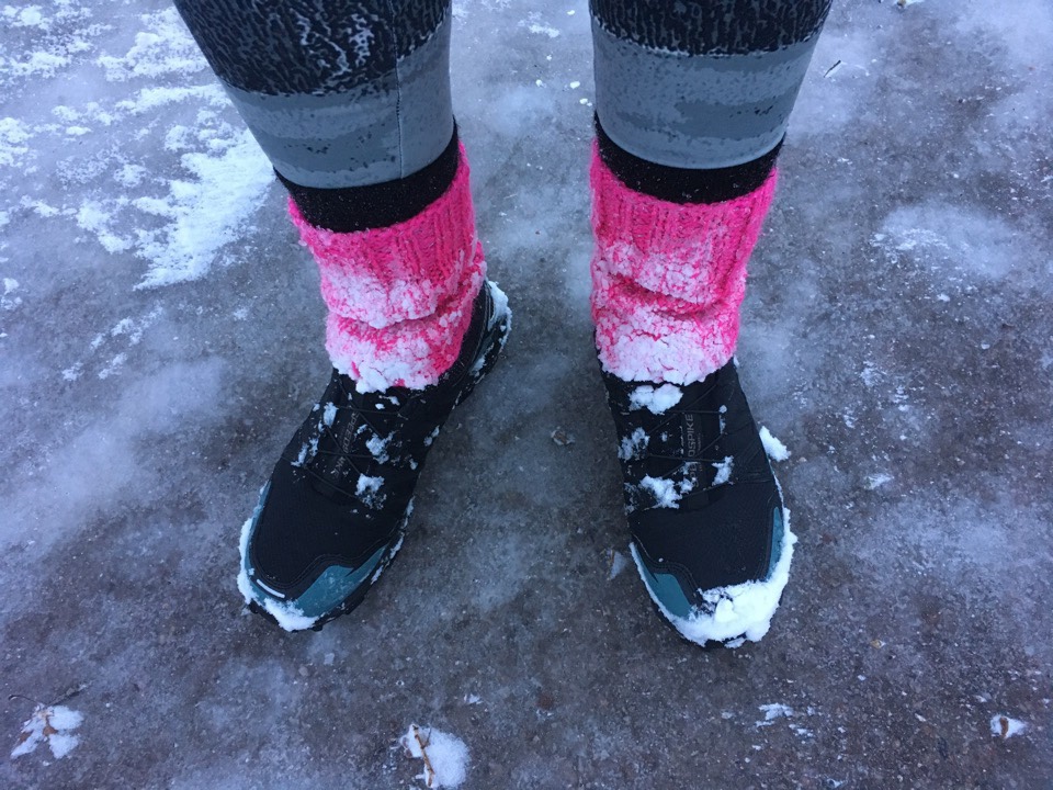 Talvijuoksussa suosin kerrospukeutumista. Jalassa minulla oli Lidlin talvijuoksutrikoot, joiden alle ei tarvinnut laittaa aluskerrastoa. Jalassa oli villasekoitteiset sukat ja itse tekemäni säärystimet. Kesätakin alle laitoin vain yhden hieman paksumman pitkähihaisen paidan. Koville pakkasille pukeudun paksumpiin vaatteisiin, mutta pienessä pakkasessa pärjää yllättävän ohuella varustuksella.