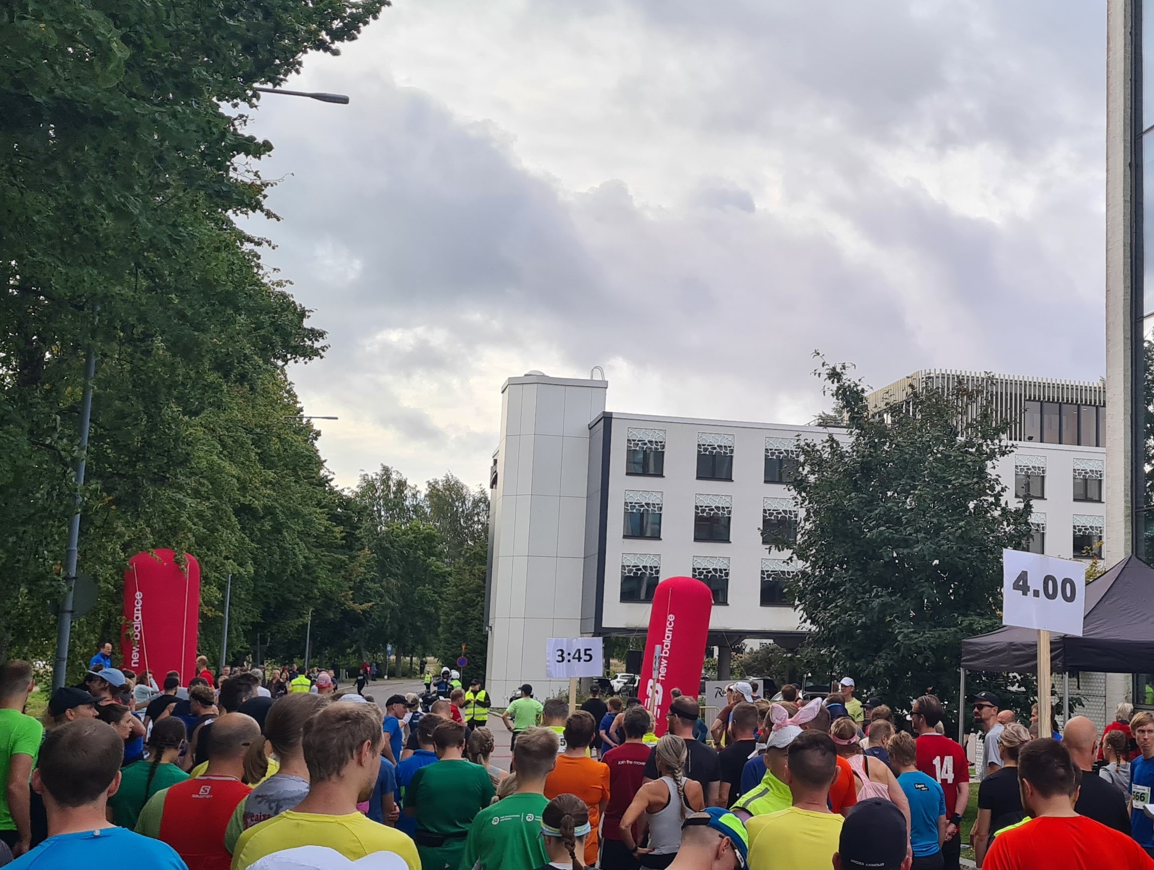 Ryhmityin lähtöalueella neljän tunnin loppuaikaan tähtäävien jänisten taakse. Jäniksiä oli kaksi. Onneksi toinen heistä piti koko matkan ajan päässään valkoisia pupunkorvia, joista tunnistin hänet takaapäin. Neljän tunnin aikaan tähtäävissä juoksijoissa oli selvästi enemmän miehiä kuin naisia, enkä aina nähnyt pitkien miesten takaa eteeni. En ole lyhyimmästä päästä, mutta matkan aikana piti jostain raosta vilkaista, että jänikset pysyivät sopivalla etäisyydellä.