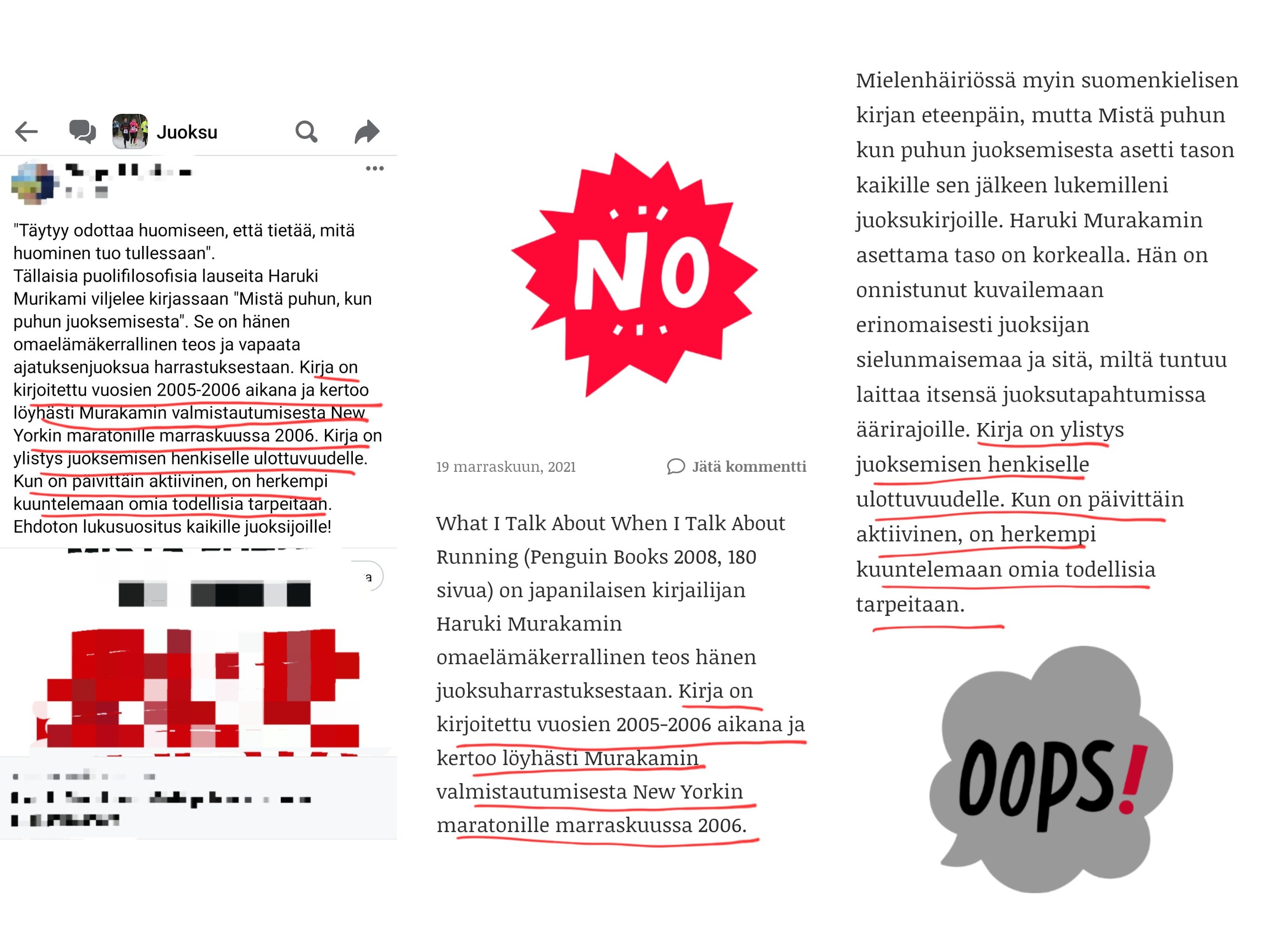 Facebook-julkaisussa sen sijaan kirjoittaja esitti ominaan ajatuksia, jotka ovat suoria lainauksia blogistani. Siis minun mielipiteitäni.