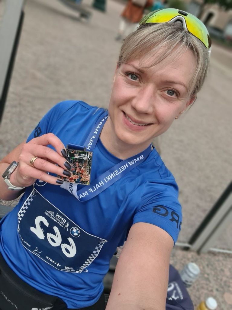 Mitä lähemmäs maali tuli, sitä upeammalta alkoi tuntua. Helsinki Half Marathonilla palkitaan parhaat loppukirit. En siinä(kään) mittelössä pääsisi podiumille, mutta leikkimielinen kisa sai kiristämään vauhtia. En ehtinyt poseerata maalissa olleelle kuvaajalle. Kahden tunnin pitkikseksi suunniteltu lenkki kiristyi vauhdikkaammaksi: nettoaikani oli 1:56:04 tuntia.