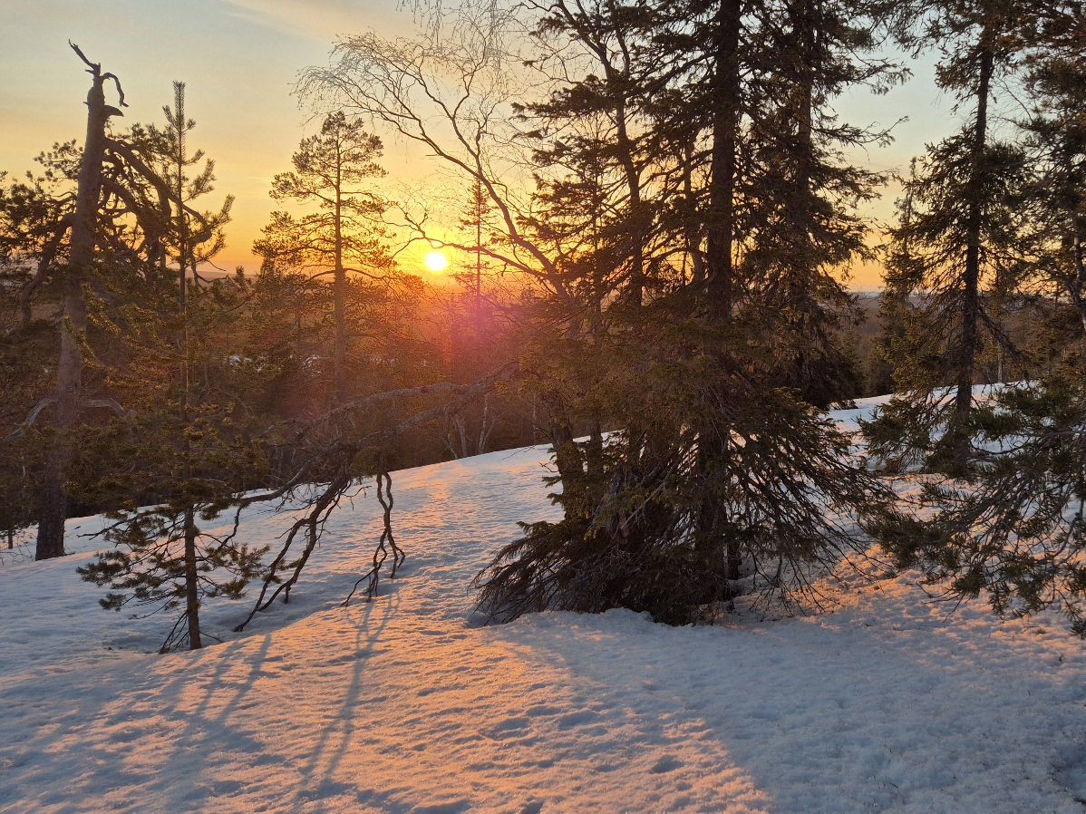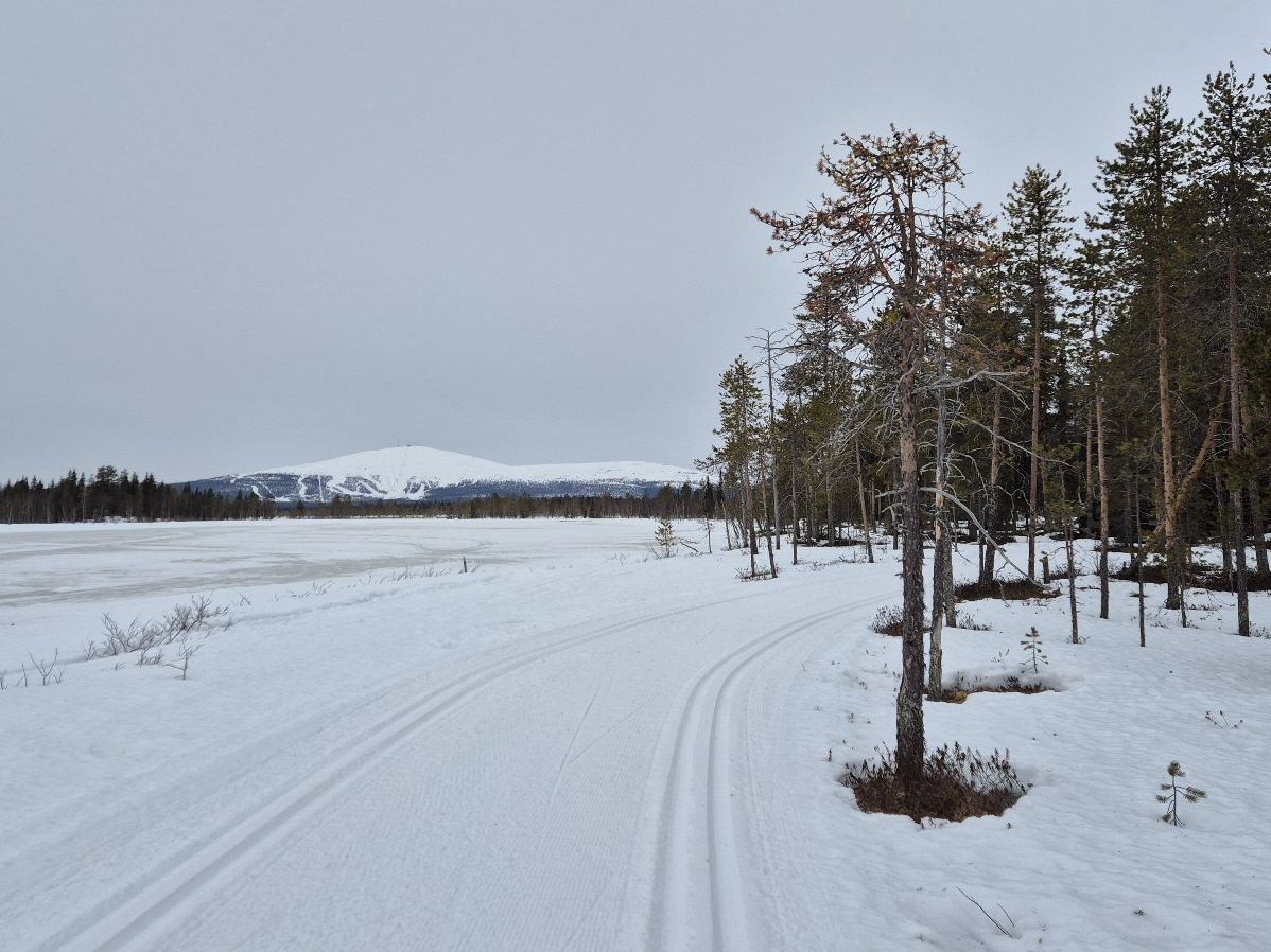 Olin pelännyt, että lämmin ja vähäluminen talvi myös Lapissa olisi ollut polkujen tuho, mutta onnekseni olin väärässä. Alusta oli kova, mutta ei jäinen. En tarvinnut nastalenkkareita, eikä sellaisia minulla ollut mukanakaan. Polkujuoksukengät, joissa oli karkea pohjakuvio, riittivät.