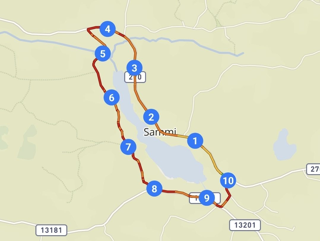 Juoksimme mieheni kanssa yhdessä maaliviivan yli. Aikamme oli 53:18 minuuttia. Kelloni näytti matkaksi 9,93 kilometriä, eli reitti oli himpun verran alimittainen. Mutta eipä sitä ollut ilmoitettukaan virallisesti mitatuksi. Aika hyvin talkoovoimin järjestetyltä kylätapahtumalta joka tapauksessa. Keskivauhtini oli ollut 5:22 min/km.