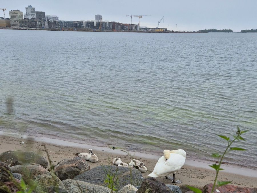 Pilvet alkoivat ripotella päällemme pieniä pisaroita. Meri hiveli hellin liikkein rantahiekkaa ja muutoin makasi massiivisena paikoillaan. Vastarannalla jykevät kerrostalot nousivat kohti harmaata taivasta. Joutsenperhe kulutti päiväänsä vesirajassa parempia aikoja odotellen. Juoksijalle kostea sää sopi hyvin: oli helppo hengittää.