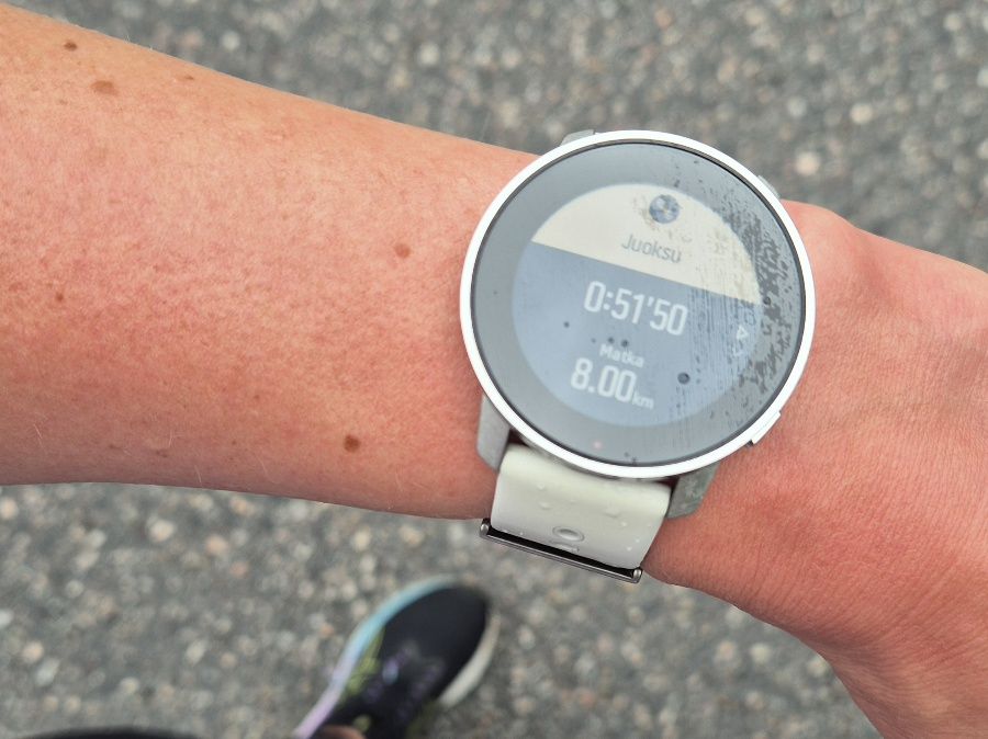 Sade alkoi pommittaa meitä yhä kovemmin. Minulle riitti aiottua lyhyempi lenkki, eikä juoksukaveriani tarvinnut sen enempää suostutella lähtemään kotiin. Parkkipaikalla minulta puuttui tasaluvusta vain kymmenen metriä. Juoksin parkkipaikan halki, kunnes kellooni tuli kaunis pyöreä lukema: kahdeksan kilometriä. Sitten kiiruhdin autoon suojaan sateelta.
