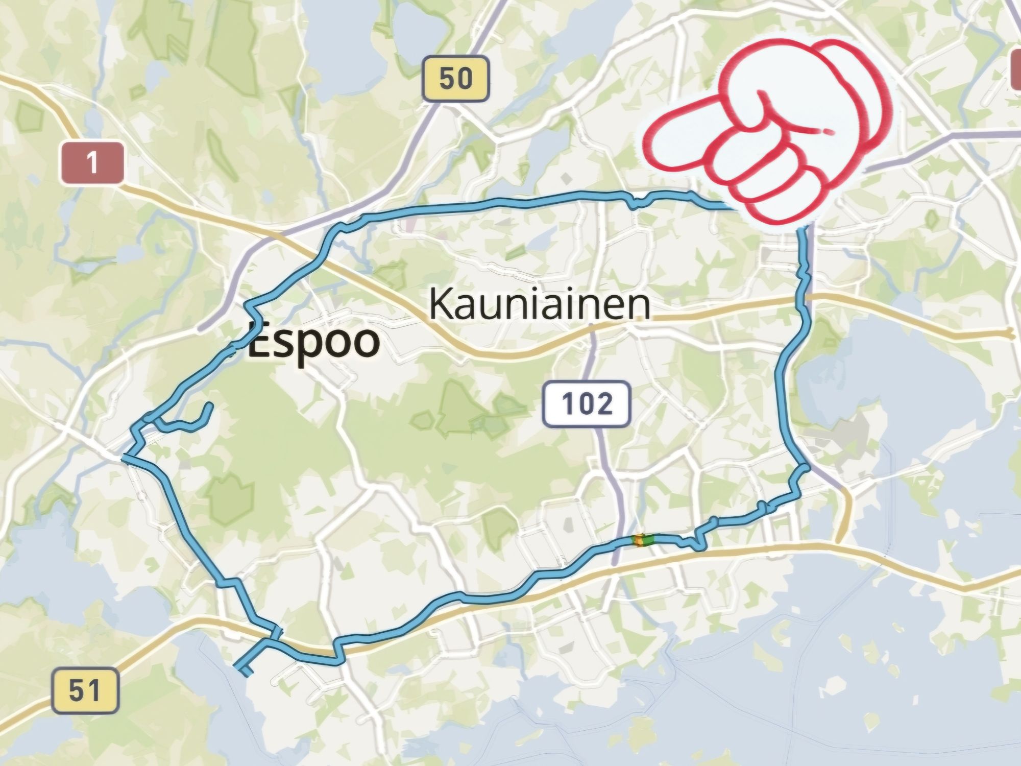 Juhannuspäivää seuraavan sunnuntain lenkkiä varten kaivoin taas esiin urheilukelloni sovelluksen ja sieltä heat mapin. Katsoin, missä muut olivat tässä kuussa pyöräilleet. Päätin mennä Leppävaarasta Tapiolaan, sieltä Kivenlahteen ja edelleen Kauklahteen. Kauklahdesta lähtisin takaisin Leppävaaran suuntaan.