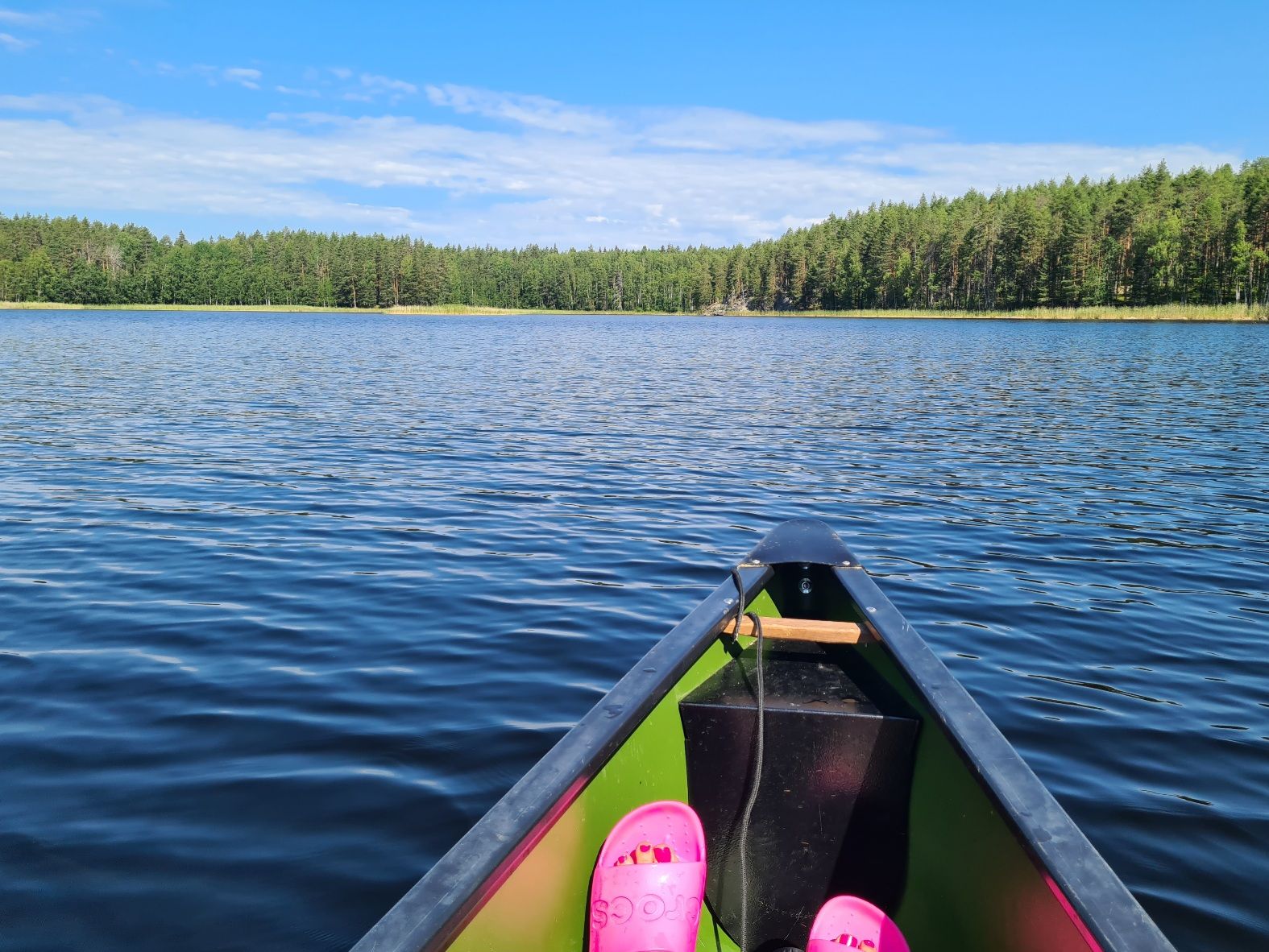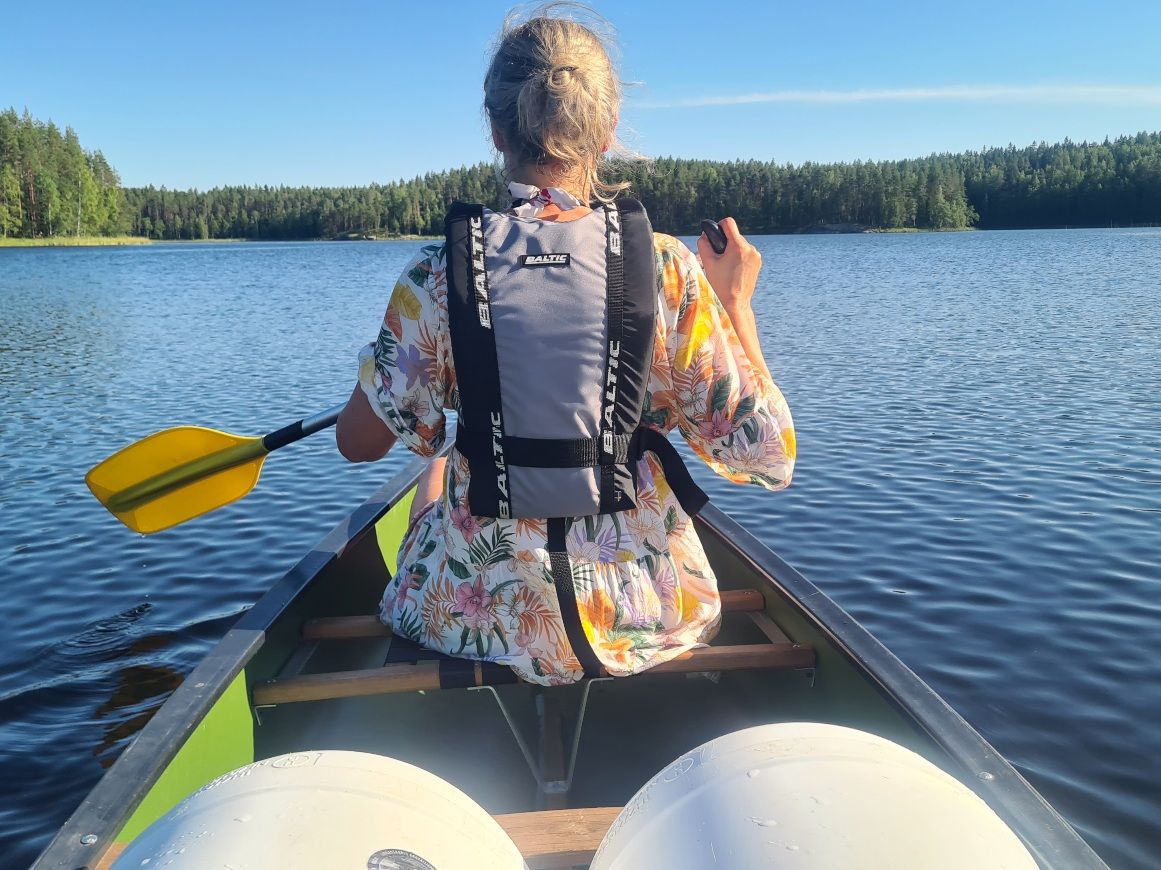 Perheessäni miehelläni on eniten melontakokemusta. Minä olen melonut muutamia kertoja umpinaisella kajakilla samoin kuin avonaisella kanootilla. Nyt lähdimme melomaan avokanootilla. Kaikilla oli päällään kelluntaliivit, ja tavarat oli aseteltu tynnyreihin. Valokuvaamista varten olin ottanut mukaani vanhan puhelimeni, jota kuljetin kelluntaliivin taskussa. Sen putoaminen veteen olisi tietenkin harmittanut myös, mutta ei niin paljon, kuin päivittäisessä käytössä olevan puhelimeni. Sen oli pakannut vesitiiviisti muiden tavaroiden sekaan.