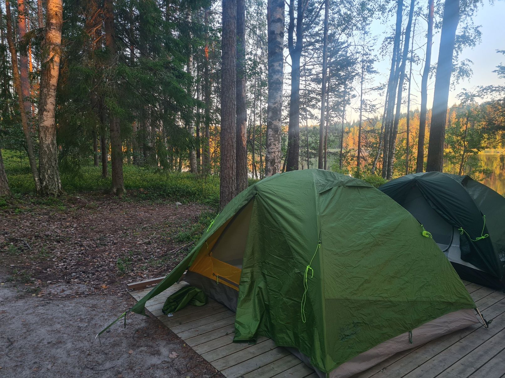 Telttoja varten Hirviniemessä on puinen laveri. Sille mahtuisi jopa neljä 2-3 hengen telttaa. Koska muut yöpyivät toisaalla riippumatoissa, saimme koko laverin käyttöömme. Pystytimme sille kaksi telttaa ja sijoitimme kaikki varusteet telttojen viereen.
