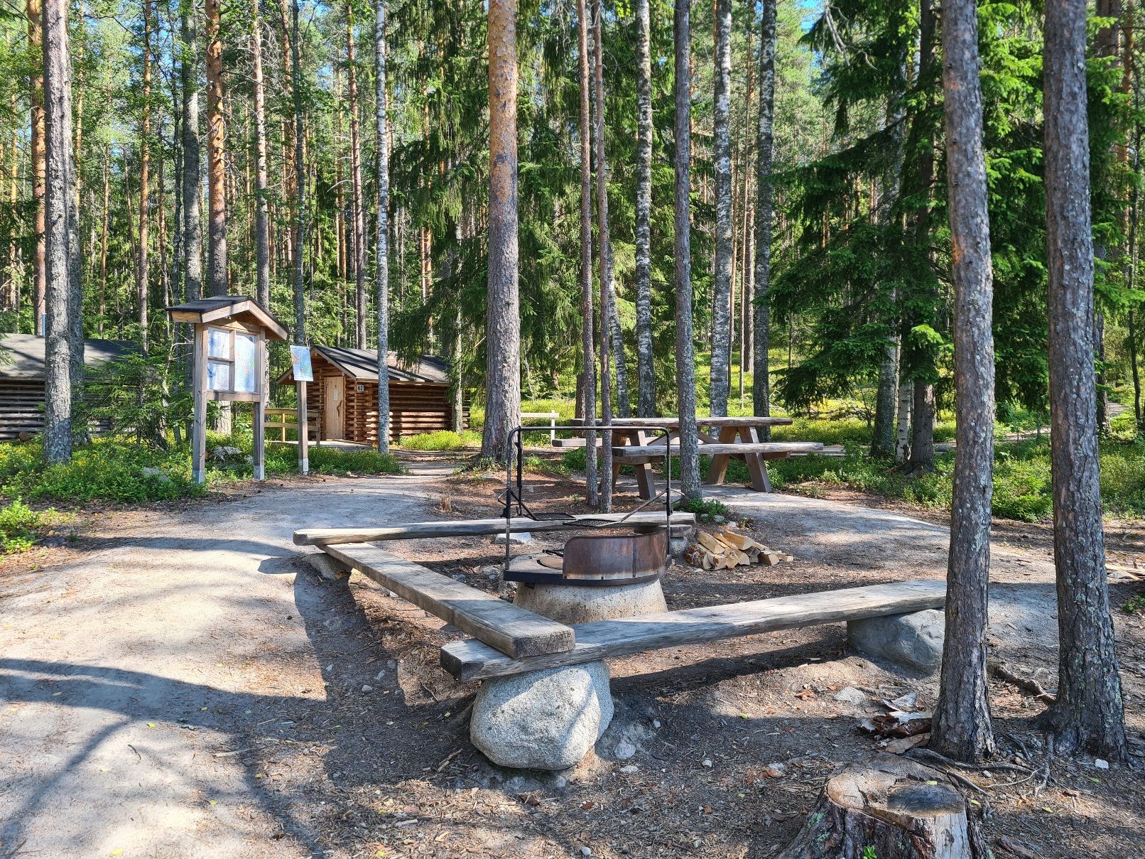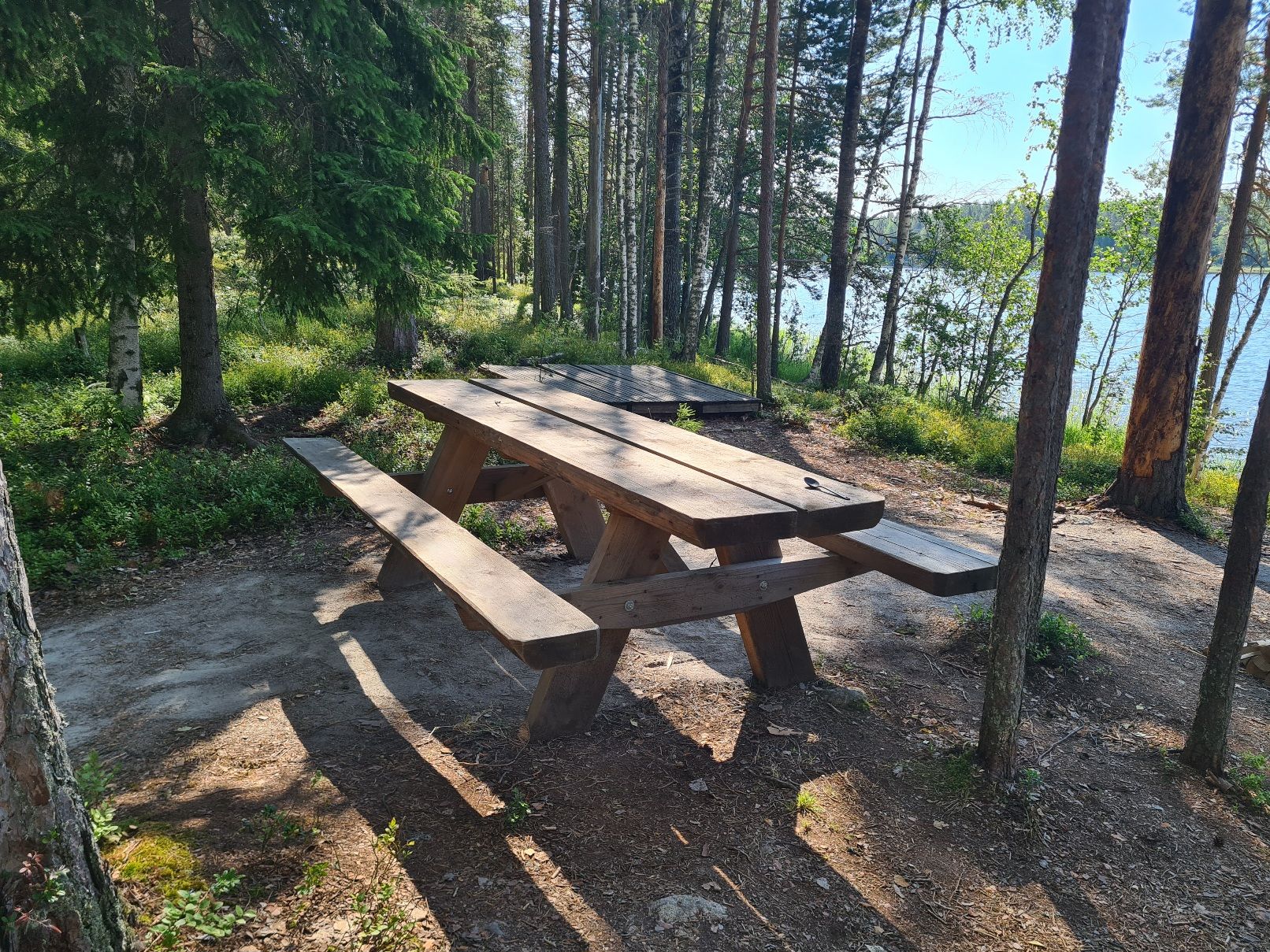 Saavuimme Hirviniemen retkisatamaan 35 minuutin ja noin kahden ja puolen kilometrin melomisen jälkeen. Järveltä päin katsottaessa telttapaikka tulisijoineen jäi ylväänä kohti taivasta kurottavien mäntyjen ja alempana oksiaan levittelevien valkokylkisten koivujen taakse. Vain laituri työntyi ulos niemen kyljestä. Suuntasimme kanoottiimme sitä kohti.