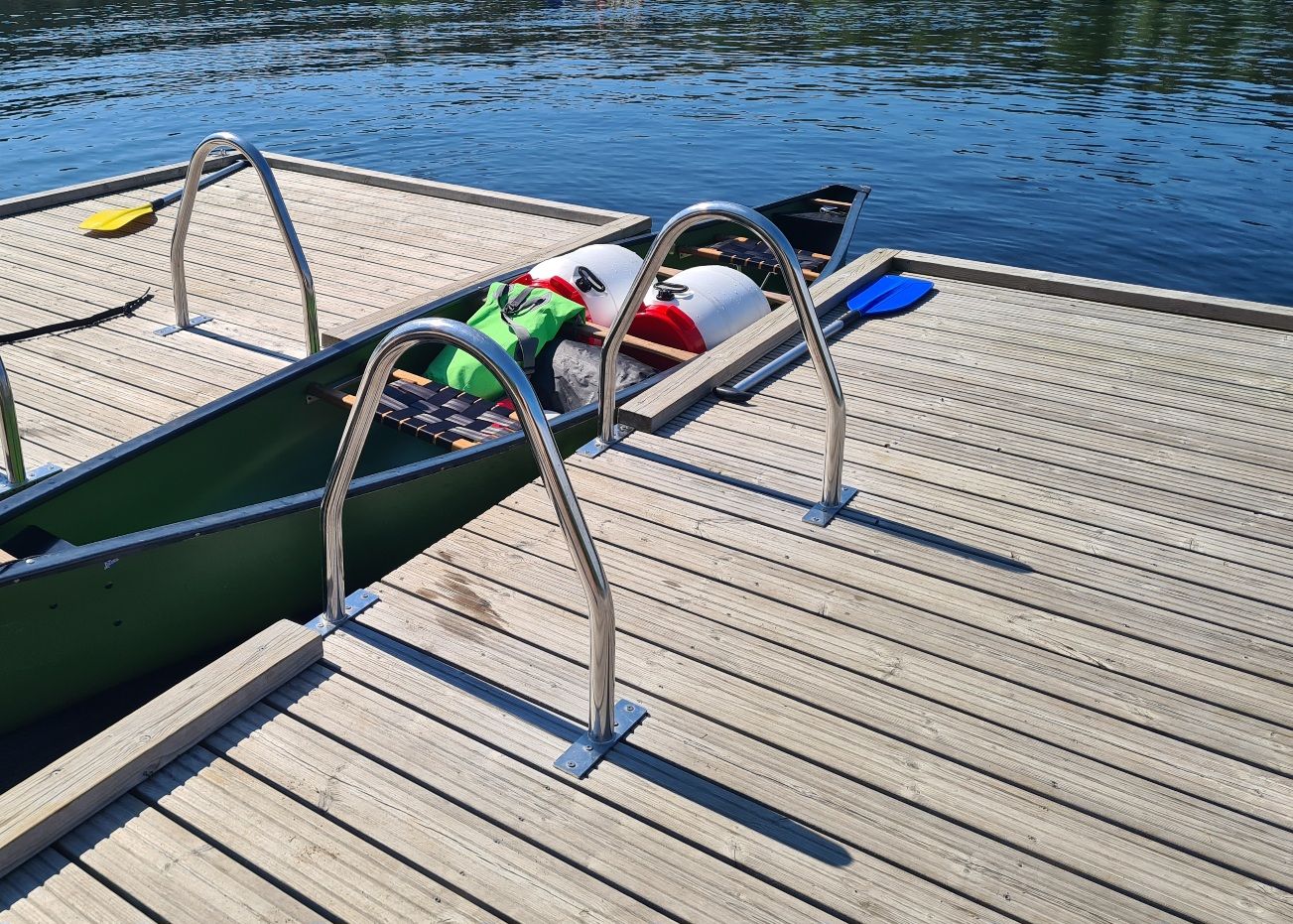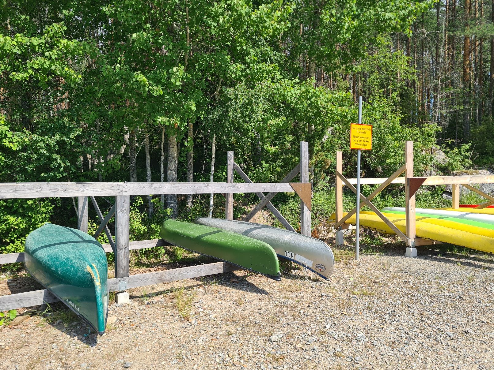 Olimme vuokranneet etukäteen kaksi kanoottia. Kanootit olivat rannassa valmiina otettavissa käyttöön. Muut tarvittavat varusteet odottivat meitä rannan varastorakennuksessa koodillisen lukon takana. Siellä olivat melat, kelluntaliivit, paperiset kartat, äyskärit ja kelluvat tynnyrit tavaroille, joita yhden yön retkellä tarvitsisimme.