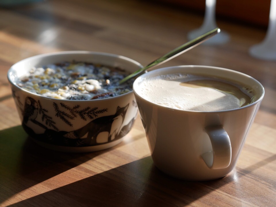 kahvia ja myslia Tältä näyttää aamupalani lähes joka aamu: mysliä, pähkinöitä, chia-siemeniä ja mantelimaitoa sekä tietenkin kahvia.